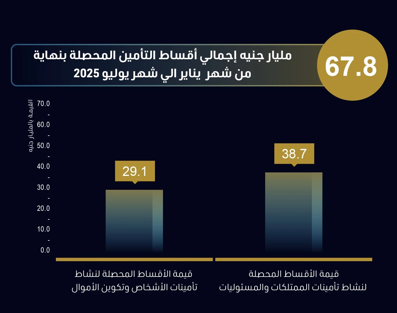 الصادرة من الهيئة العامة للرقابة المالية عن شهر يوليو لعام 2025 بالنسبة لقطاع التأمين أن قيمة إجمالي أقساط التأمين 67.8 مليار جنيه
