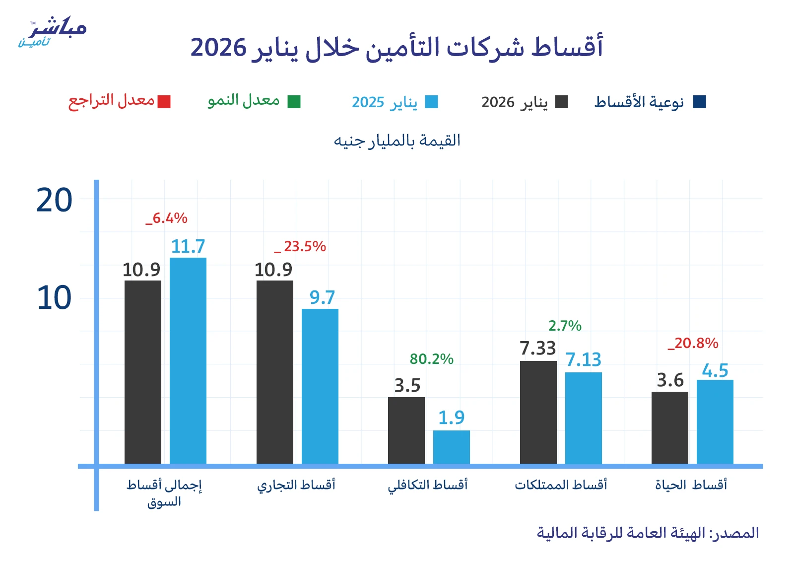 مباشر تأمين: أظهرت أحدث التقاريرالصادرة من الهيئة العامة للرقابة المالية عن شهر يناير لعام 2026 بالنسبة لقطاع التأمين أن قيمة إجمالي أقساط التأمين 10.9 مليار جنيه.