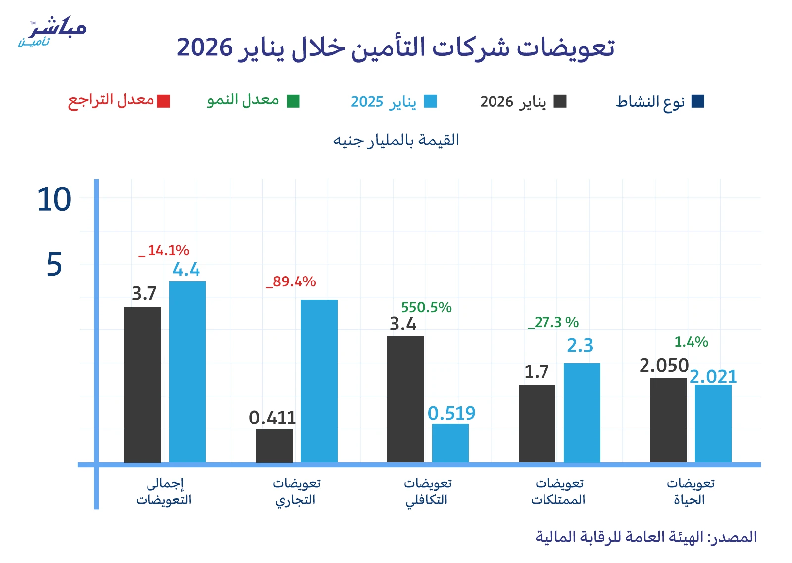مباشر تأمين : أظهرت أحدث التقارير الصادرة من الهيئة العامة للرقابة المالية عن شهر يناير لعام 2026 أن إجمالي قيمة التعويضات المسددة من قطاع التأمين 3.8 مليار جنيه خلال يناير 2026.